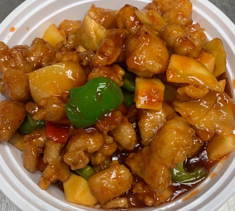 Chinese delivered from Great Wall Chinese Restaurant at 39 N. Monday Thursday and Friday. Chicken chunks with dried orange peel and hot pepper in a sweet hot sauce.